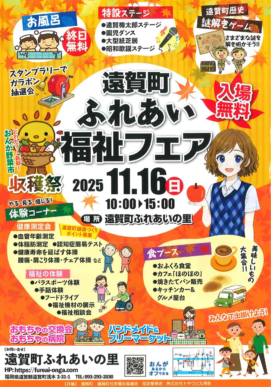 子供から高齢者まで楽しめるふれあい福祉フェア・収穫祭は、健康測定会やパラスポーツ体験、特設ステージ、遠賀町なぞときゲーム、キッチンカー屋台の食ブースなど内容てんこ盛り!