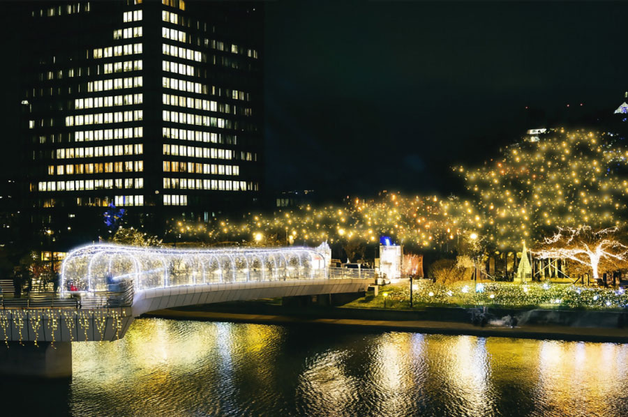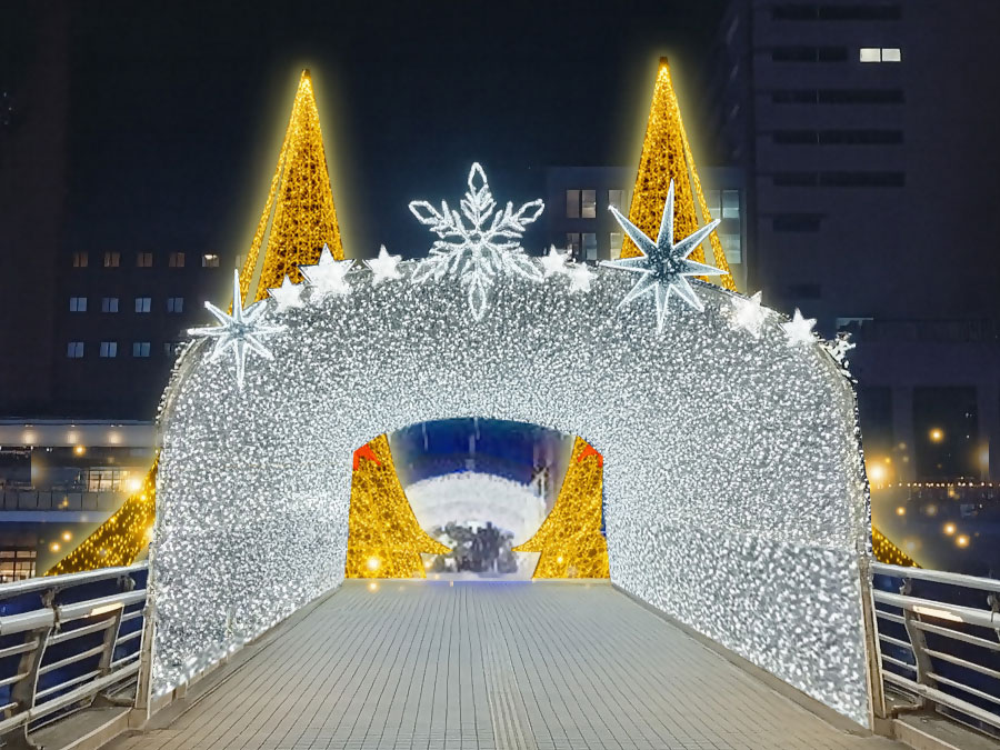今年の鷗外橋は、橋の中央から両岸へと続く白一色のイルミネーションで、冬の紫川に一直線の白銀の道を描きます。真っ白な輝きに包まれる 非日常の世界は、写真映えはもちろん、「心躍る高揚感」と「研ぎ澄まされた輝きの静寂」を同時に感じられる、光の体験をもたらします。ぜひ、幻想的な空間の中で、ゆったりと冬の小倉をお楽しみください!