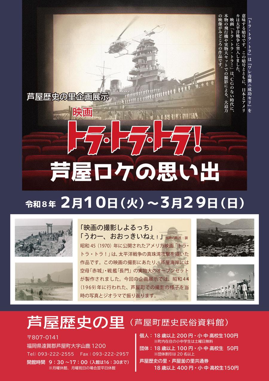 昭和45(1970)年に公開されたアメリカ映画「トラ・トラ・トラ!」は、太平洋戦争の真珠湾攻撃を描いた作品です。この映画の撮影にあたり、芦屋海岸には空母「赤城」・戦艦「長門」の実物大のオープンセットが製作されました。今回の企画展示では、昭和44(1969)年に行われた、芦屋町での撮影の様子を当時の写真とジオラマで振り返ります。